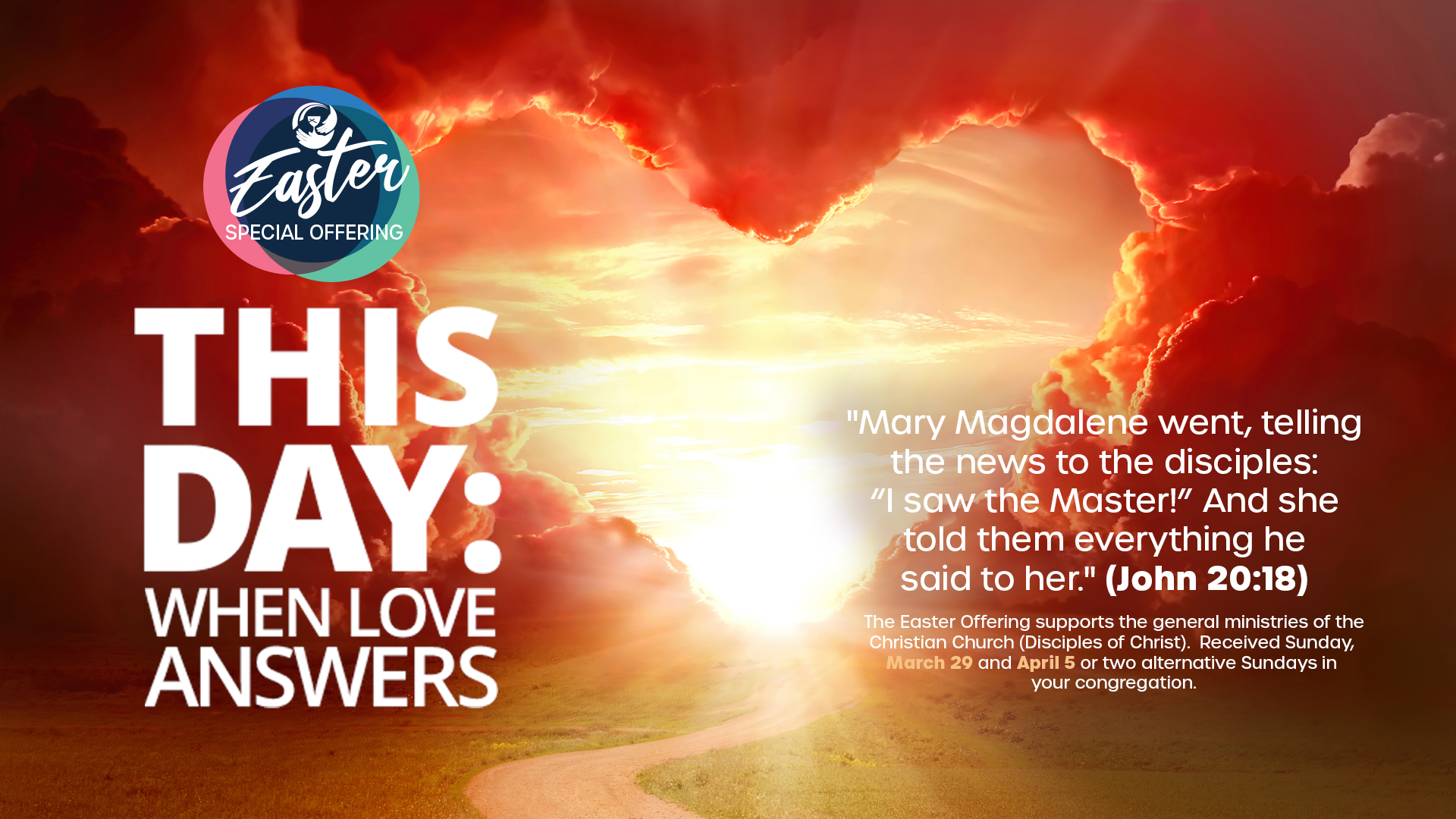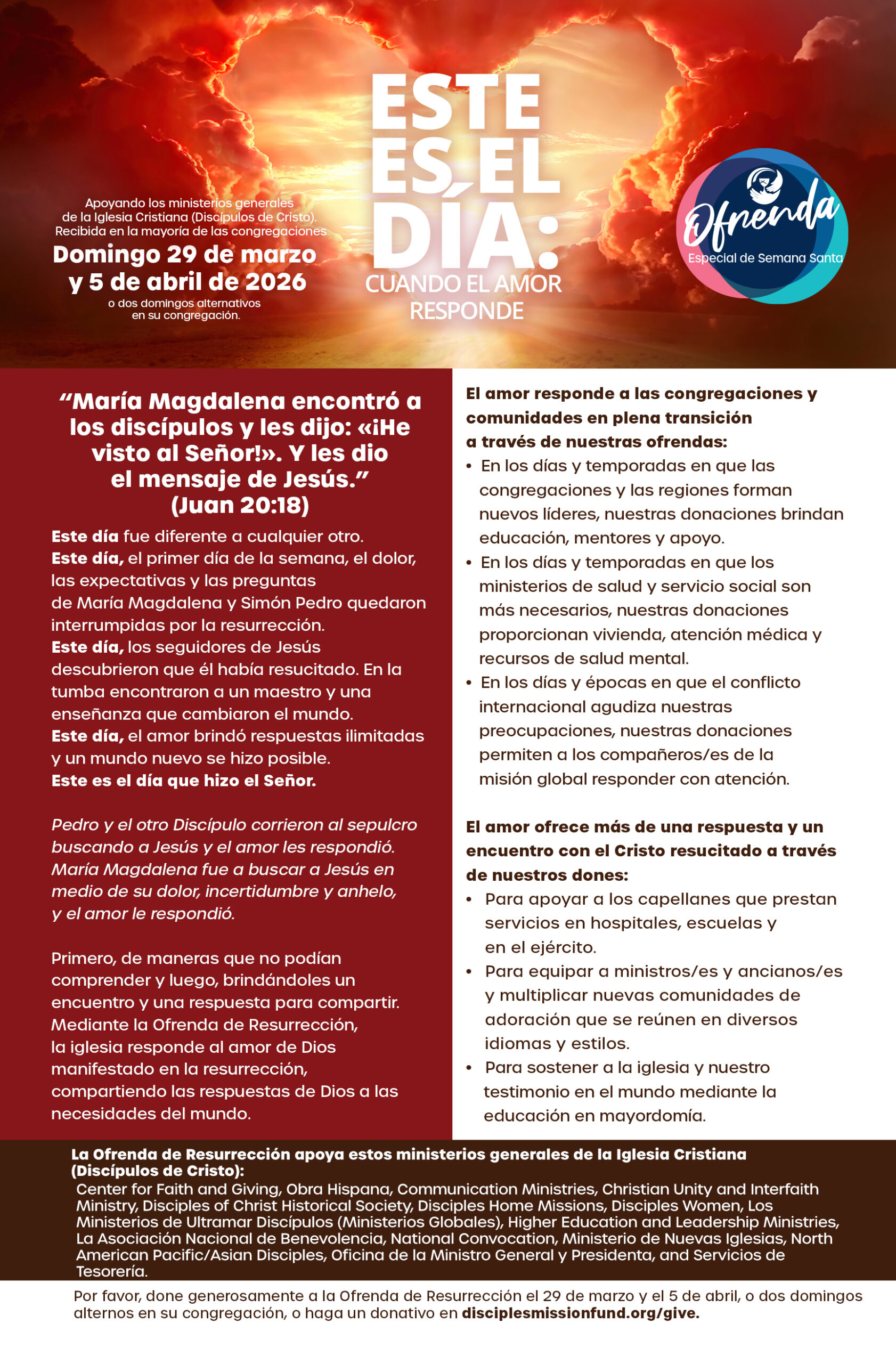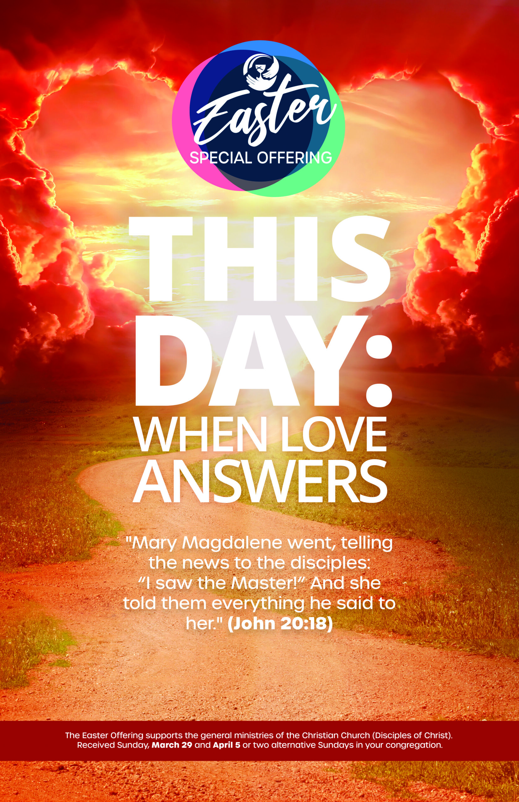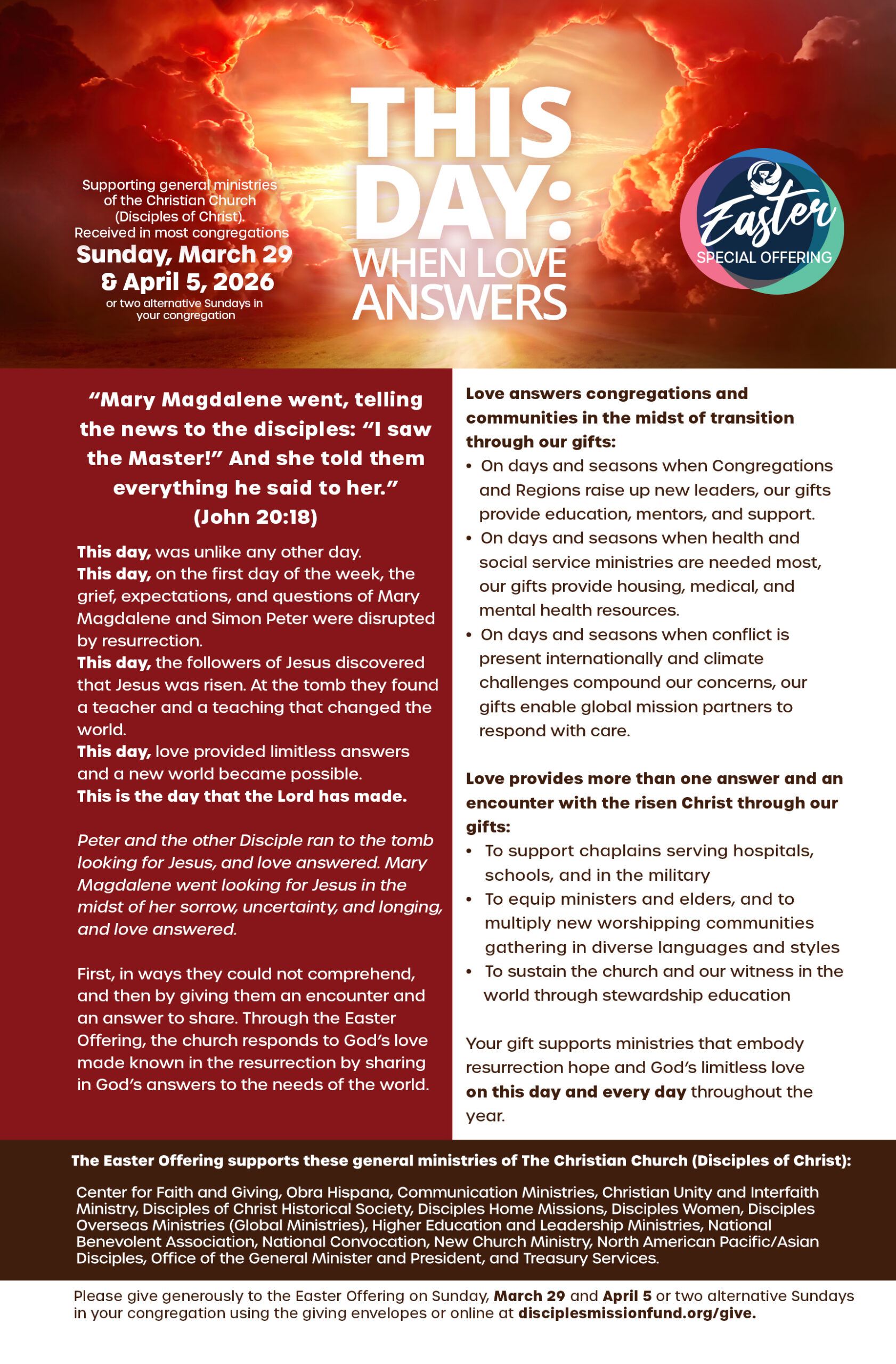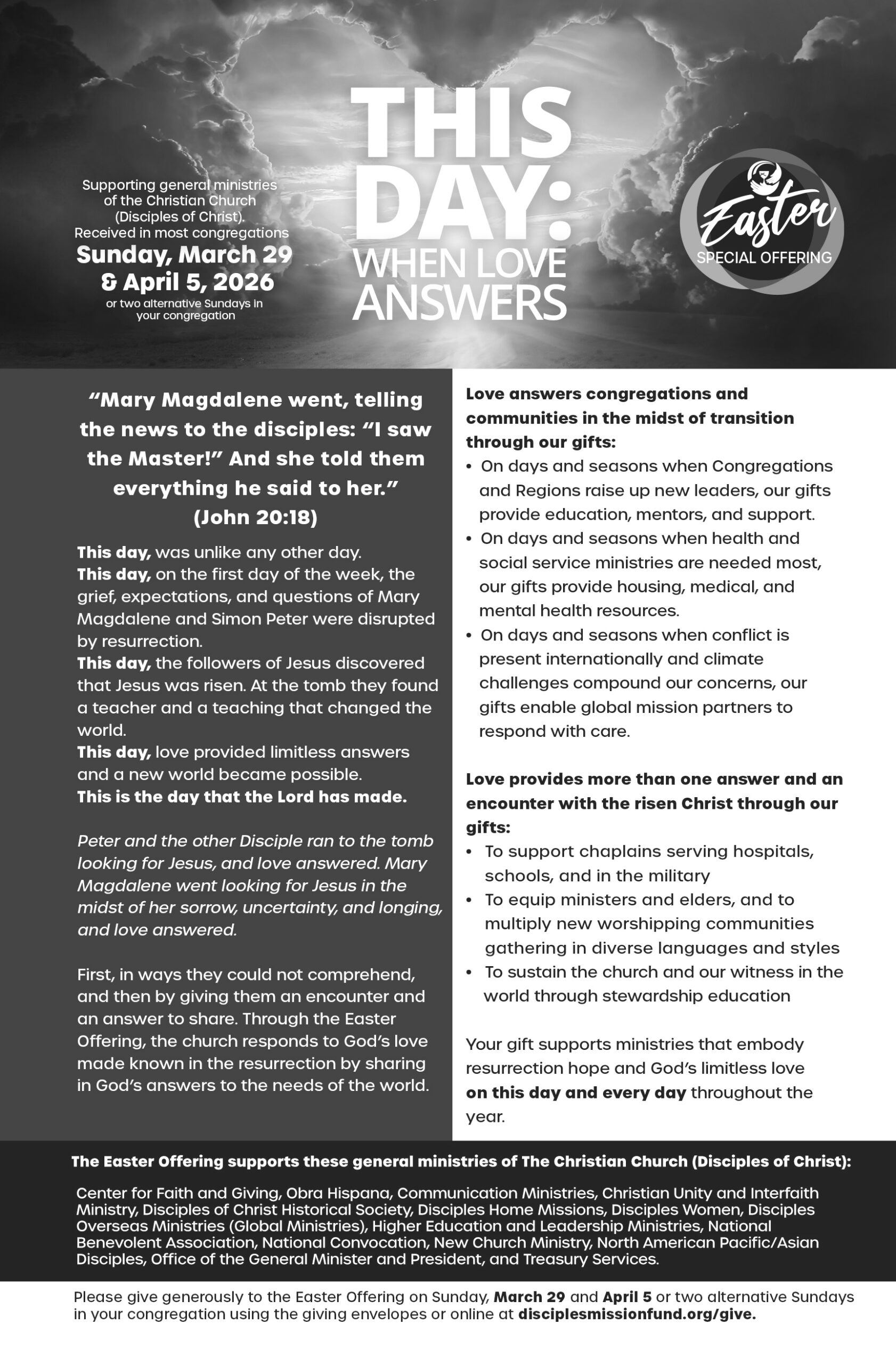 The Easter Offering, received by most congregations on March 29 and April 5, 2026, provides vital support for the general ministries of the Christian Church (Disciples of Christ). Your generous gift helps equip college students for leadership, strengthens global mission partnerships, sustains health and social service ministries, supports the formation of new congregations, cares for pastors and chaplains, and so much more.