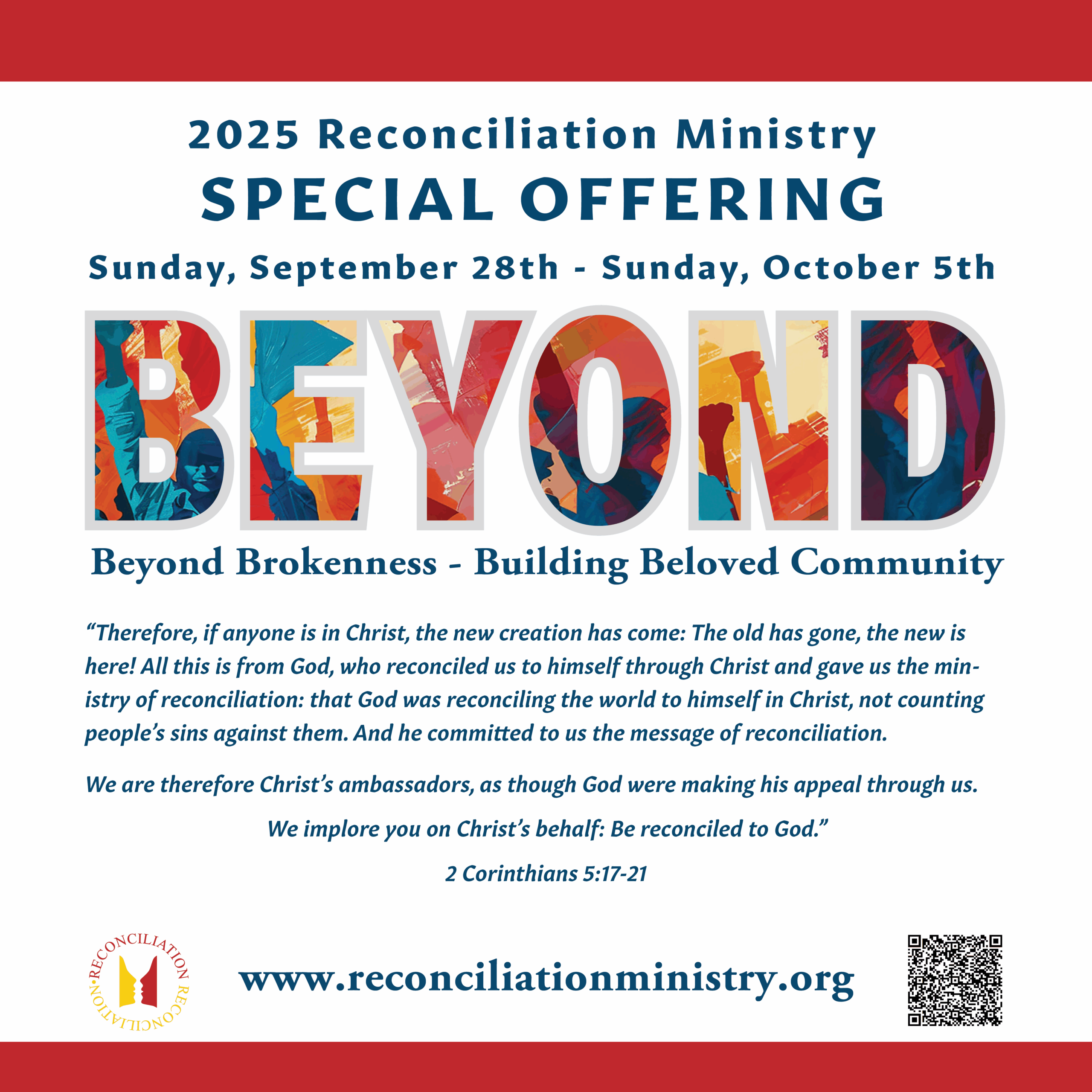 The Reconciliation Special Offering will be taken on September 28, 2025, and October 5, 2025. Your advocacy and financial support are much appreciated.